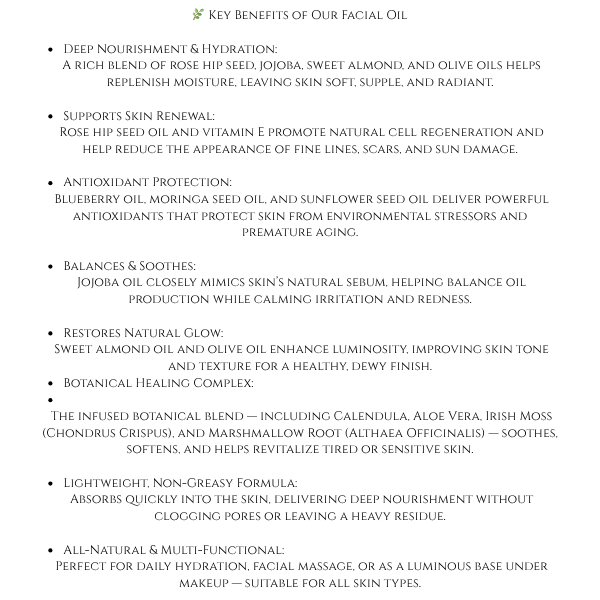 This blend is like a garden party for the skin—rich in antioxidants, omegas, and soothing plant magic.